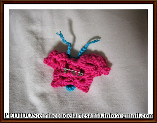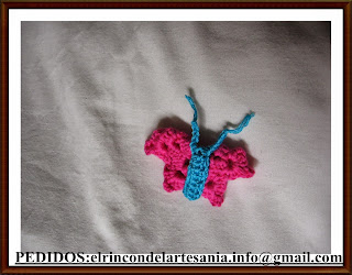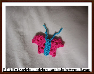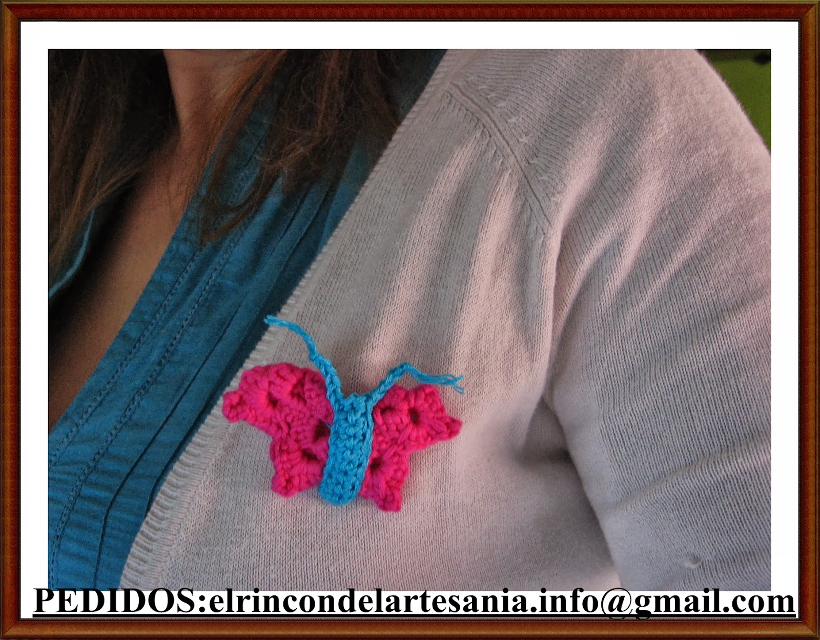 Broche de mariposa de crochet, también puede ser llavero, colgante o simplemte un amuleto. Se puede realizar en cualquier combinaciòn de colores. Son ideales como recuerdo para bodas, bautizos, cumpleaños, comuniones o simplemente porque si. Para más información, pedidos o presupuestos elrincondelartesania.info@ gmail.com