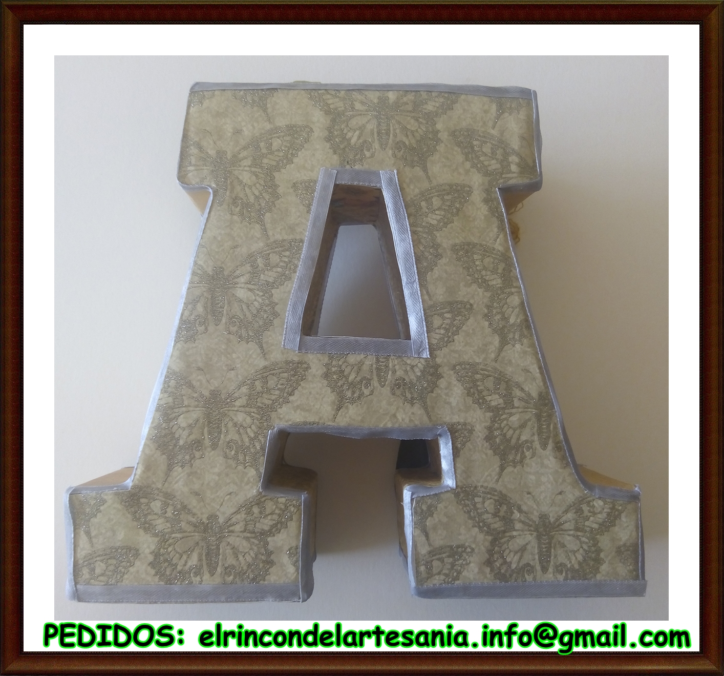 Os habíamos dicho que traeríamos cosas nuevas pues tachan..... Aquí comenzamos con letras personalizadas en primer lugar le ha tocado a la "A" que ya esta disponible. Modelo exclusivo, lo cual quiere decir que el primero que la encargue se la lleva. Tiene unas medidas de 21 cm de alto X 22.5 cm de largo X 6.5 cm de ancho. Para pedidos elrincondelartesania.info@gmail.com